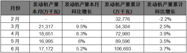 2016年6月中国发动机产量为17172.4万千瓦,同比增长5.2%。2016年1-6月止累计中国发动机产量106693万千瓦,同比增长3.7%。