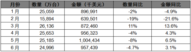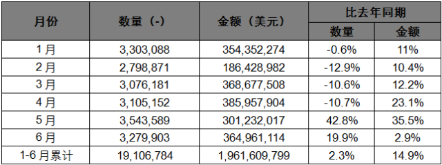 2016年1-6月中国电动机及发电机出口数量为142,761万台,同比下降4.1%;2016年1-6月中国电动机及发电机出口金额为5,310,465千美元,同比下降0.1%。