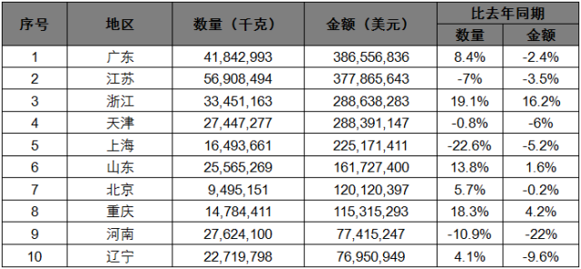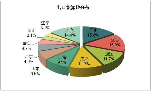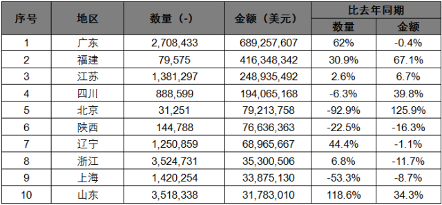 广东、江苏和浙江是我国发动机零件的主要出口货源地,2016年1-6月,上述三省市的发动机零件出口数量合计占我国该产品出口总量的40.6%,出口金额合计占我国该产品出口总额的42.6%。