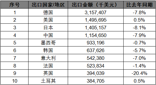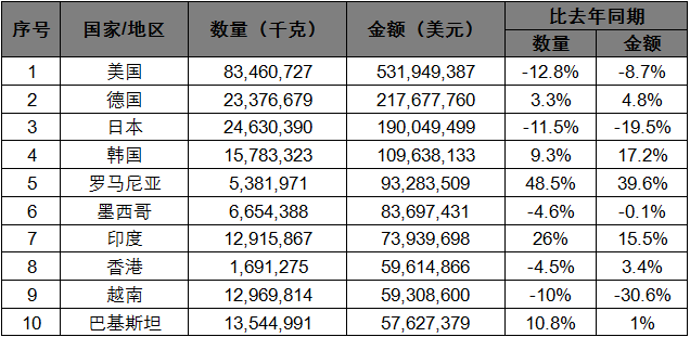 从2016年1-6月的出口数据可以看出,我国发动机零件的主要出口市场是美国、德国、日本、韩国、罗马尼亚、墨西哥、印度、香港、越南和巴基斯坦等。