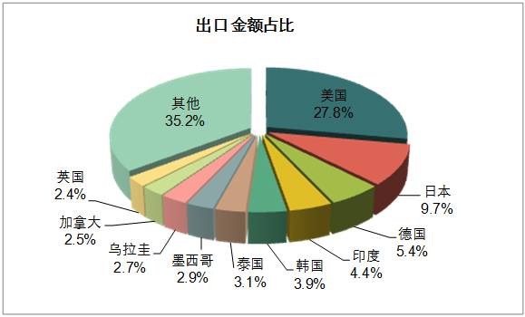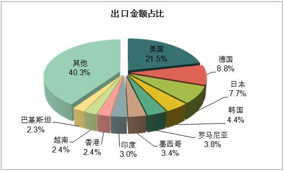 美国是我国发动机零件的主要出口市场,对美国的出口金额占我国该产品出口总额的21.5%。