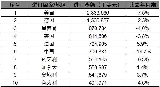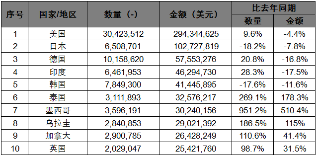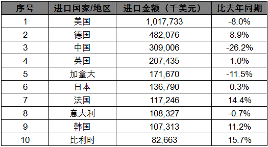 2016年1-3月,以上十位发动机零件主要进口市场中,美国、德国和墨西哥位列前三,进口金额分别为23.34亿美元(同比下降了7.5%)、15.31亿美元(同比下降了2.3%)、8.71亿美元(同比下降了4%),中国位居第六位。