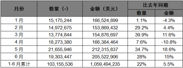 2.1.1.2016年1-6月中国发动机零件出口数量和金额