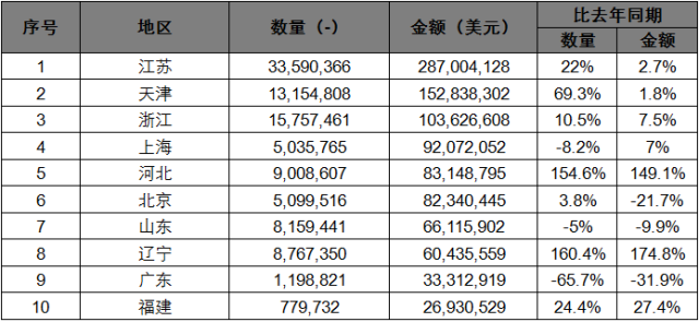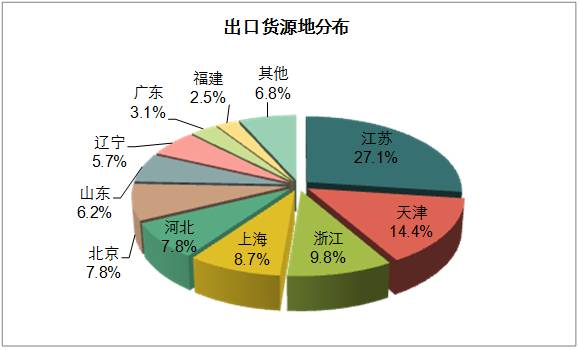 江苏、天津和浙江是我国其他发动机及动力装置的主要出口货源地,2016年1-6月,上述三省市的其他发动机及动力装置出口数量合计占我国该产品出口总量的60.6%,出口金额合计占我国该产品出口总额的51.3%。
