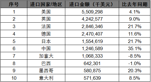 2016年1-3月,以上十位燃气轮机主要进口市场中,美国、英国和法国位列前三,进口金额分别为55.09亿美元(同比增长了4.1%)、42.43亿美元(同比增长了9%)、28.46亿美元(同比增长了21.7%),中国位居第六位。