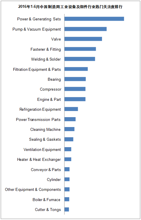 2016年1-6月,根据中国制造网统计数据,工业设备各子行业中,Power & Generating Sets买家关注度最高,其次是Pump & Vacuum Equipment。
