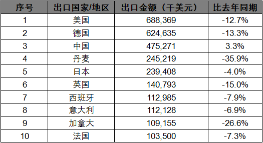 2016年1-3月,以上十位其他发动机及动力装置出口市场中,美国、德国和中国位列前三,出口金额分别为6.88亿美元(同比下降了12.7%)、6.25亿美元(同比下降了13.3%)、4.75亿美元(同比增长了3.3%)。