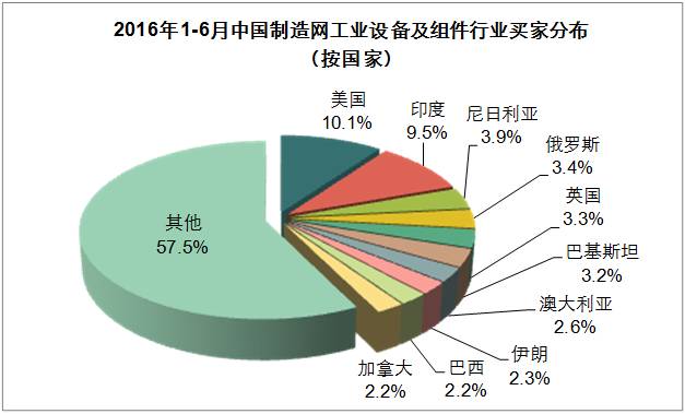 按大洲分,2016年1-6月中国制造网工业设备及组件行业买家主要分布在欧洲、北美、南亚、非洲、中东和南美等地区。按国家分,2016年1-6月来自美国、印度、尼日利亚和俄罗斯等国家的买家需求较旺盛。