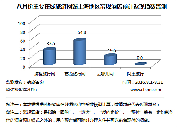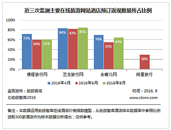 劲旅咨询最新的监测数据显示, 8月份在线旅游网站酒店返现占比与6月份相比除阿里旅行外其他三家均有所上升,阿里旅行有明显下降。携程旅行网的8月份在线酒店返现占比与6月相比有小幅度上升,从60%上升到61%;8月去哪儿网的在线酒店返现占比为64%,较6月的55%相比上升了9个百分点;艺龙旅行网8月的在线酒店返现占比也有所上升,从82%上升到85%;在监测样本范围内,阿里旅行8月仅有两家酒店参与返现。