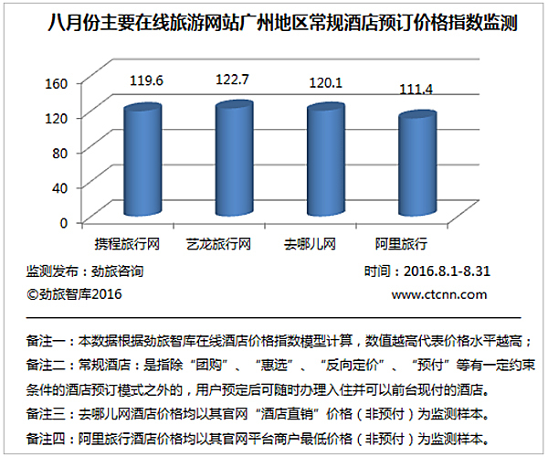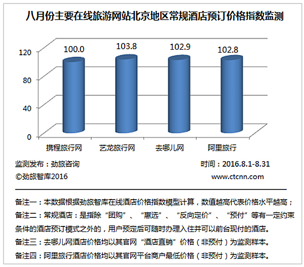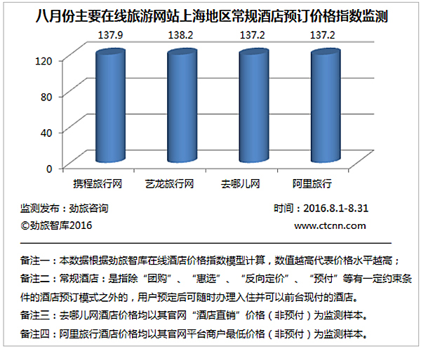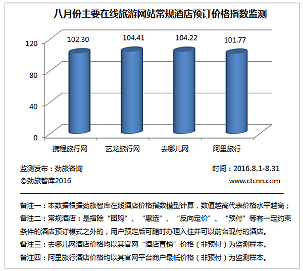 国内领先的旅游市场研究咨询机构—劲旅咨询最新发布了《2016年8月中国在线酒店价格监测分析报告》,对国内主要在线旅游网站酒店预订业务价格情况进行了深入跟踪调研。这是继《2012年7月份中国在线酒店价格监测分析报告》后连续发布的第四十六份针对国内主要在线旅游网站酒店预订业务价格监测的分析报告。