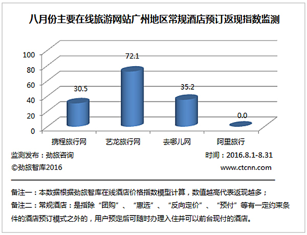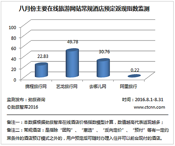 8月艺龙旅行网的在线酒店返现力度依旧最大,返现指数为49.78,与6月相比有所下降,环比下降了6.89%;携程旅行网8月份返现指数为22.83,与6月的28.58相比,环比下降了20.12%; 8月份去哪儿网的返现指数为30.76,与9月份相比下降了0.01个百分点。根据劲旅监测显示,在监测样本范围内,阿里旅行的酒店返现力度大幅减弱,为0.22,而6月份的返现指数为12.25。