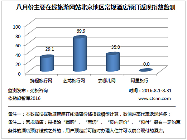 8月,艺龙旅行网北京地区返现指数为69.9,返现指数仍旧位居第一,与6月份的74相比有所下降,环比下降了5.54%;8月份携程旅行网返现指数为29.1,与6月份的34.4相比有所下降,环比下降了15.41%; 8月份去哪儿网北京地区返现指数为35.0,与6月份相比,环比下降了22.39%。