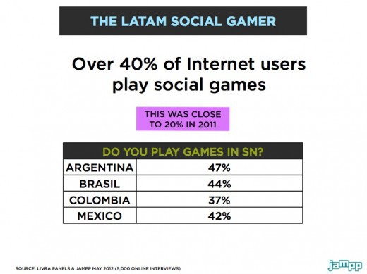 对于社交游戏行业来说,这无疑是件好事情——那些在社交网站上一呆就是几小时的人,在和朋友玩游戏的可能性要大得多。Jampp的研究数据(下图)显示,40%以上的拉美互联网用户都玩社交游戏,而这一比例在2011年约为20%。由此可见,拉美社交游戏市场的增长非常迅速。