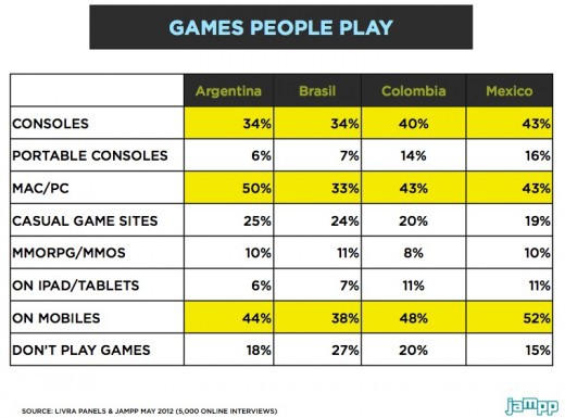 从左至右各列依次为阿根廷、巴西、哥伦比亚、墨西哥;从上至下各行依次为游戏机、手掌机、Mac/PC、休闲游戏网站、多人在线游戏、平板电脑、手机、不玩游戏