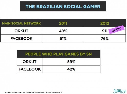 从2011年到2012年,巴西社交游戏玩家在Orkut上的比例从49%骤减至9%,而在Facebook上的比例从51%增至76%。