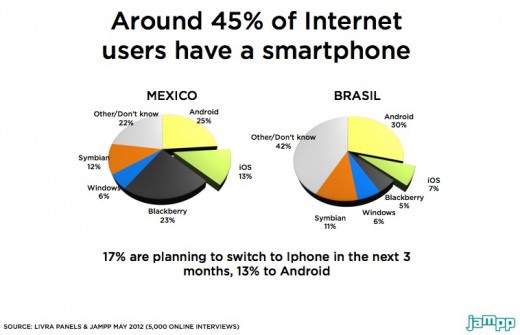 45%左右的拉美互联网用户拥有智能手机,左右分别为墨西哥和巴西的情况,17%的人准备在3个月内换用iPhone,13%的人准备换用Android手机