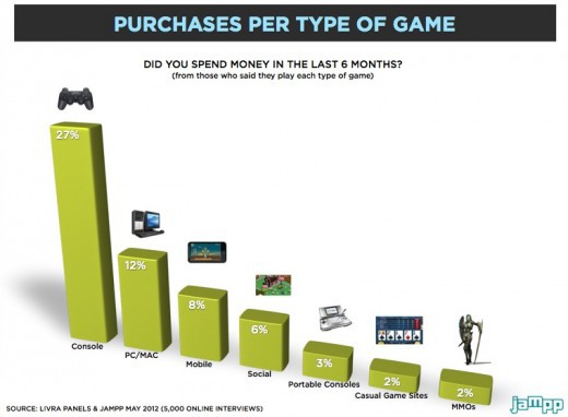 各类游戏玩家中曾在过去6个月内花过钱的玩家比例,社交游戏仅有6%,休闲游戏仅有2%,前三名依次是游戏机(27%)、桌面电脑(12%)和移动平台(8%)