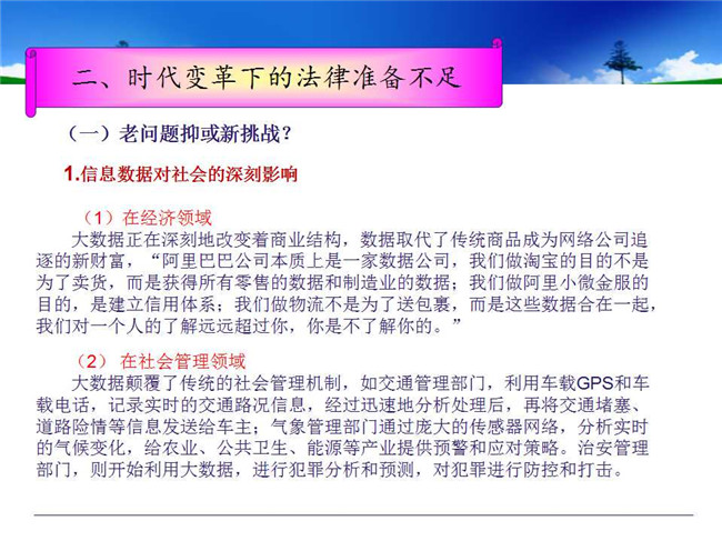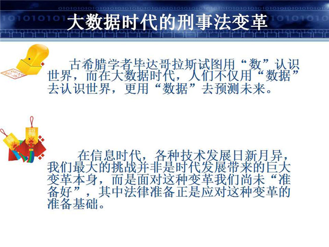 古希腊的毕达哥拉斯曾提出,希望用数认识世界。在大数据时代,我们不但用数据认识世界,还用数据预测未来。大数据技术给我们带来许多挑战和改变,我们必须做好准备,特别是做好法律层面的准备。