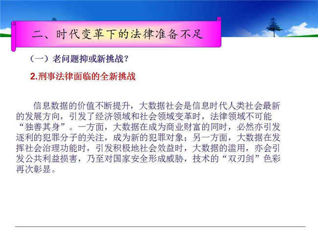 如今,大数据在社会管理领域的应用非常多,交通管理部门、公共卫生管理部门、气象部门等都在利用数据分析技术。在大数据技术普及的情况下,《刑法》面临着全新的挑战。在利用数据发挥积极效益的同时,数据滥用也会对公众利益、国家安全产生了严重威胁。