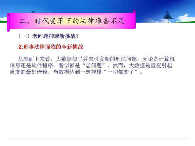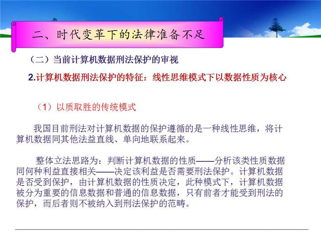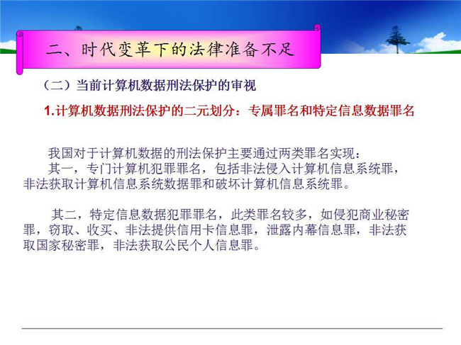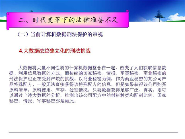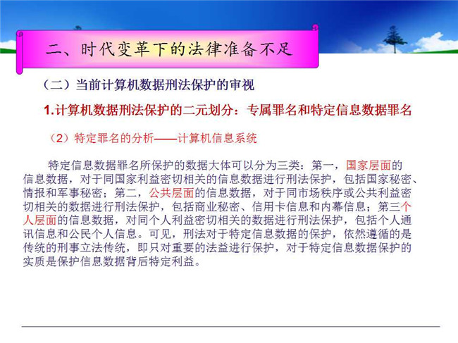 面临这种数据风险,我们的《刑法》并非没有准备,其他法律也有预防举措。计算机数据刑法保护有一个“二元划分”,分为专属罪名和特定信息数据罪名,专属罪名保护的是计算机信息系统,而不是数据本身;特定信息数据犯罪罪名比较多,比如说侵犯商业秘密罪、非法获取国家秘密罪等。然而,传统的信息数据保护体系,是一种纵向思维,仅保护特定领域的信息。而大数据时代,对于信息数据的利用是一种基于规模数据分析利用的横向思维,孤立的零散数据背后看似并没有重要法益,但达到一定数量层级则会同个体安全、公共安全、国家安全密切相关,比如农民在百度上搜索“明年种什么农作物比较值钱”,类似的零散信息不会威胁国家安全,但是量达到一定程度,却可以用来分析、预测未来农作物的产量,具有重要的价值,甚至关乎国家安全。