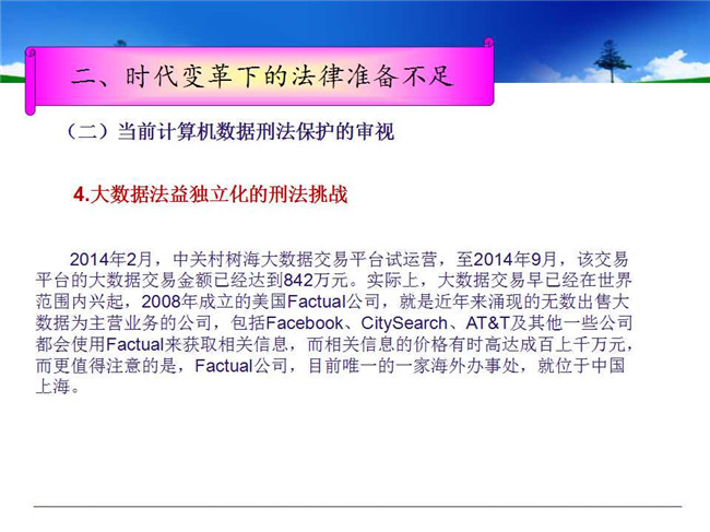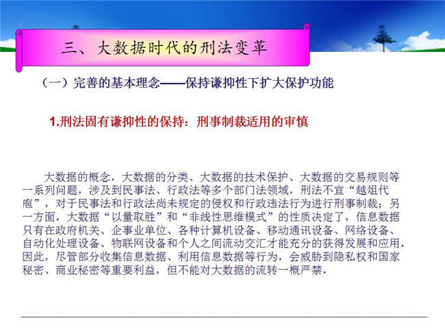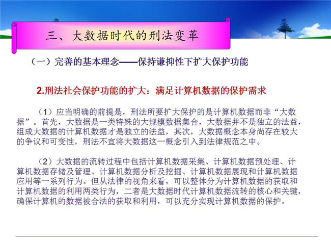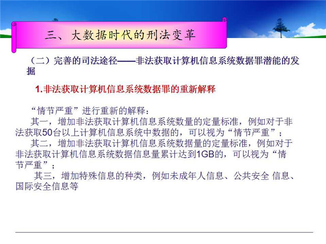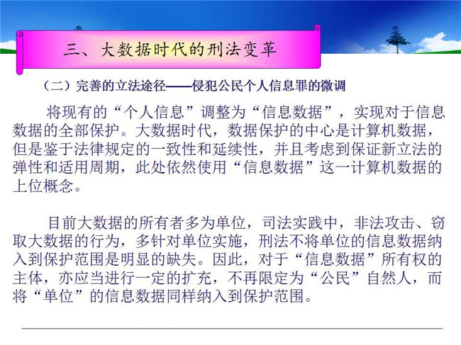 因此,在大数据时代,有必要改变仅保护同重要法益直接相关的传统信息数据刑法保护模式,将信息数据作为一种独立的法益进行保护。短期来看,应当通过对非法获取计算机信息系统数据罪、侵犯公民个人信息罪等罪名进行一定的扩大解释,发挥已有罪名的潜力,扩大刑法对信息数据的保护范围;而长期来看,大数据技术引发的刑事立法更新不可避免,未来需要立法机关设立更为全面的信息数据刑法保护罪名体系。(实习记者 宿思 记者 金毛毛 杨婉华)