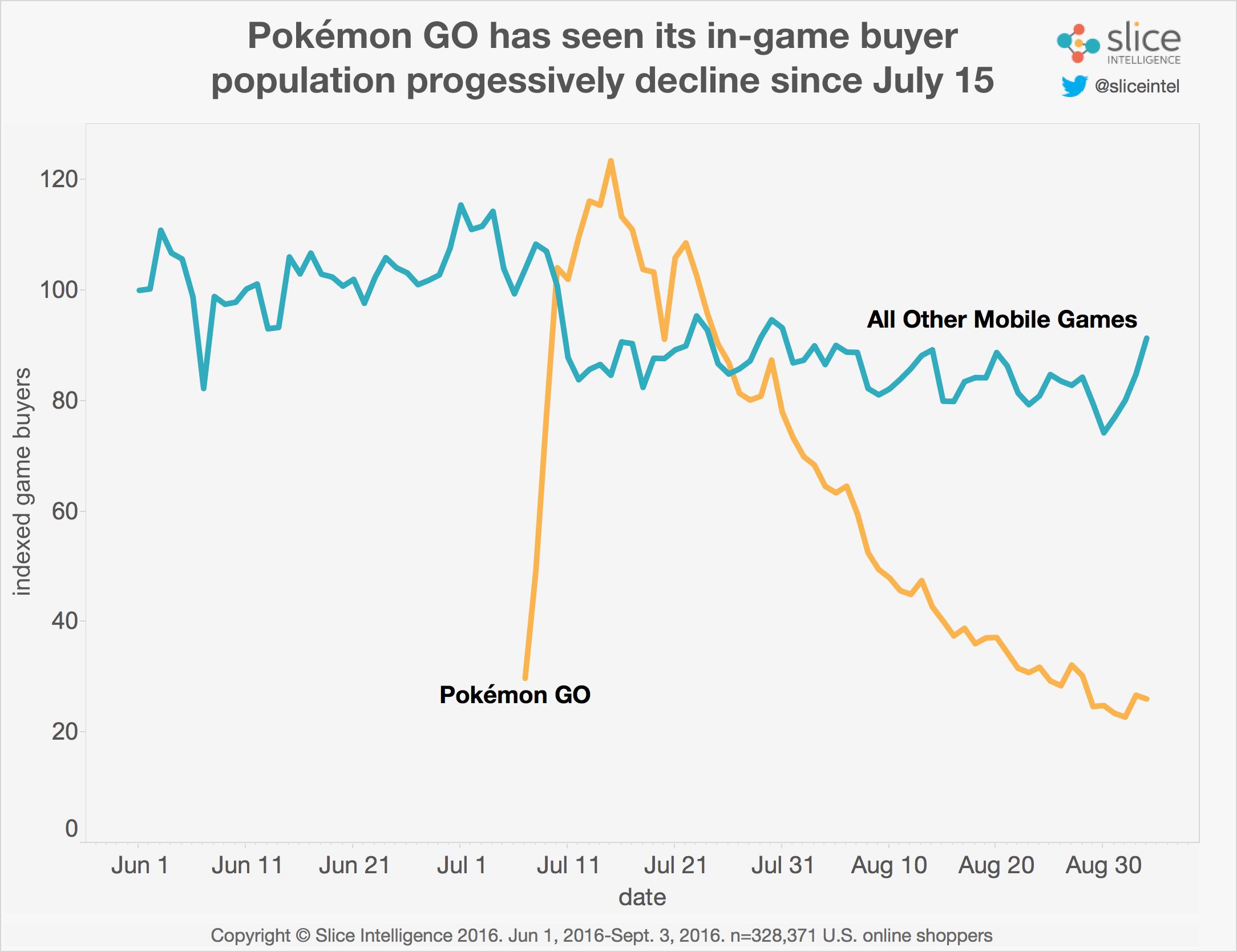 据市场研究公司Slice Intelligence的最新报告指出,《精灵宝可梦GO》在美国的付费玩家数量相较7月15日的峰值已经大跌79%,但是8月份,它依然“吞下”了全美移动游戏总收入的28%。