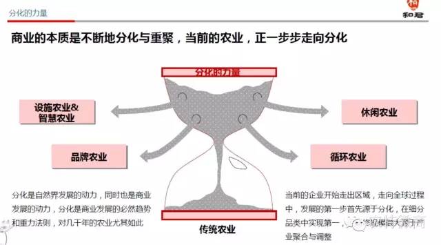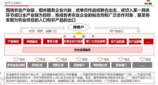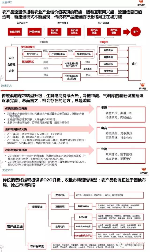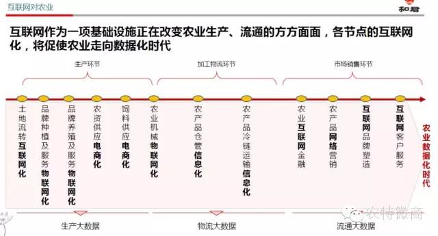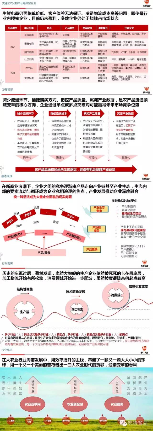中国“互联网+农业”产业产业链商机分析报告 【摘要】一套全面解读中国农业产业链的商业的PPT, ➊农业互联网化的12大细分解析; ➋生产、加工、流通当下问题解析; ➌畜牧业为案例解析问题的根源和产业链业态; ➍电商对传统农业的产业链改造; ➎农产品流通的O2O升级趋势; ➏互联网化的商机。 来源:和君.罗龙,农特微商整理发布 更多阅读:互联网+农业,我们能跟美日等国学点什么“互联网+”赋能于农: 现状及展望农业B2B电商发展现状网贷天眼:2016年互联网+供应链金融研究报告30页PPT读懂互联网保险行业互联网+重构组织生态——微信企业号白皮书透视“消费中国”——“互联网+”下的观察新维度“互联网+”重塑智能家居CNNIC:2015年第37次中国互联网络发展状况统计报告–企业“互联网+”深入融合(六)CNNIC:2015年第37次中国互联网络发展状况统计报告–企业“+互联网”广泛应用(五)“互联网+”的12 个行业趋势阿里研究院:2015年”互联网+产业集群”研究报告Digitimes:2015年Q2 中国光纤网络已经覆盖3.30亿个家庭刘强东:“互联网+”探索与实践北京市统计局:北京市“互联网+生活服务”应用情况调查