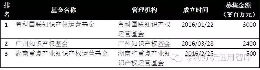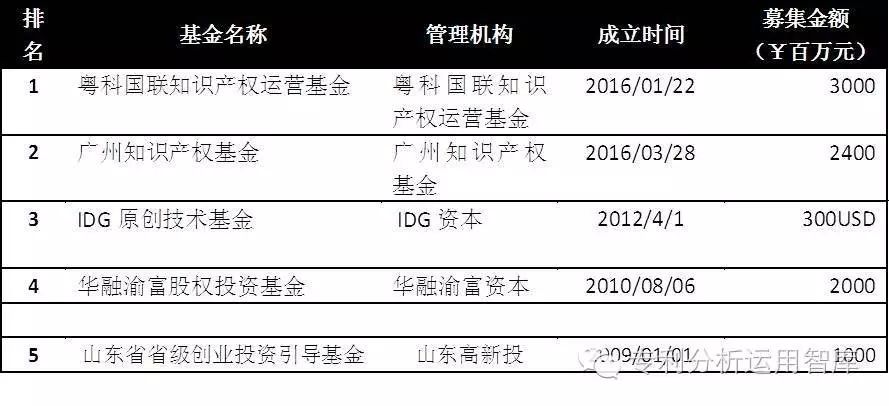 排在首位的粤科国联知识产权运营基金规模最大,认缴规模30亿人民币,该基金由广东省政府及广东省粤科金融集团有限公司共同发起设立,由广东省粤科国联知识产权投资运营基金负责管理,首期规模5亿元人民币,主要投资于高档数控机床和机器人、新一代信息技术等战略产业以及知识产权服务业。
