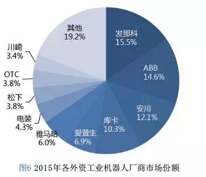 对比不同外资厂商2015年的销售情况,外资厂商仍以四大家族为首,即发那科、ABB、安川和库卡。四家厂商合计销售占外资品牌总销售量的比例超过50%,发那科销售量最高,占比达到15.5%。