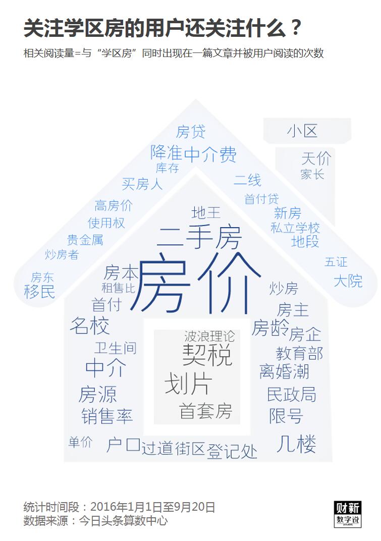 关注学区房的用户还最关注什么,“房价”当然首当其冲。此外, “离婚潮”、 “过道”房(只求落户不求居住)也成为阅读热词,“名校”“私立校”“教育部”也是常见相关词。如果拒绝接受眼下高昂房价的现实,出国成为部分人的解决方案,因此“移民”也成为热词之一。