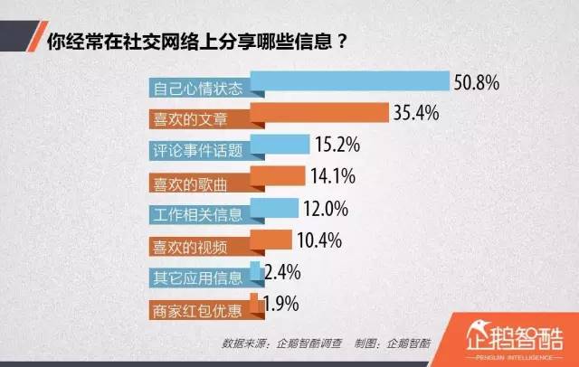 50.8%的调查者表示,他们经常在社交网络上分享自己的心情和状态。居于第二位的是喜欢的文章,占比为35.4%。