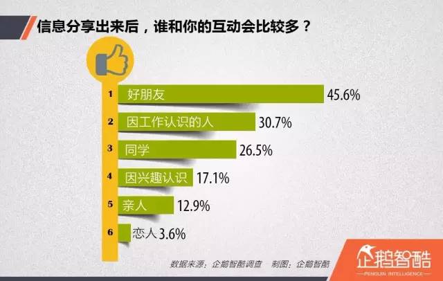互动越多,用户分享的积极性也会相应提高。从调查结果来看,信息分享后,和用户之间分享互动比较多的,首先还是自己的好朋友。其次是因工作认识的人和同学。