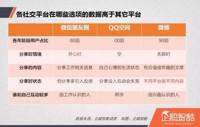 微信朋友圈:80后用户、用户更易在开心时分享、分享工作相关信息、怕分享多引人反感、因工作认识的人和自己互动较多,这些方面的用户占比都要高于QQ空间和新浪微博。