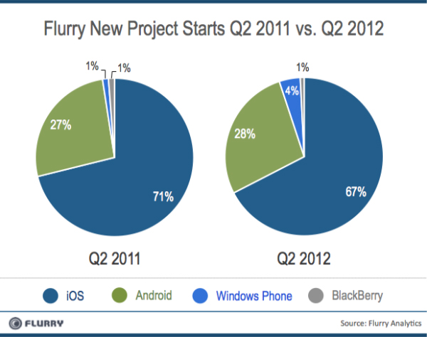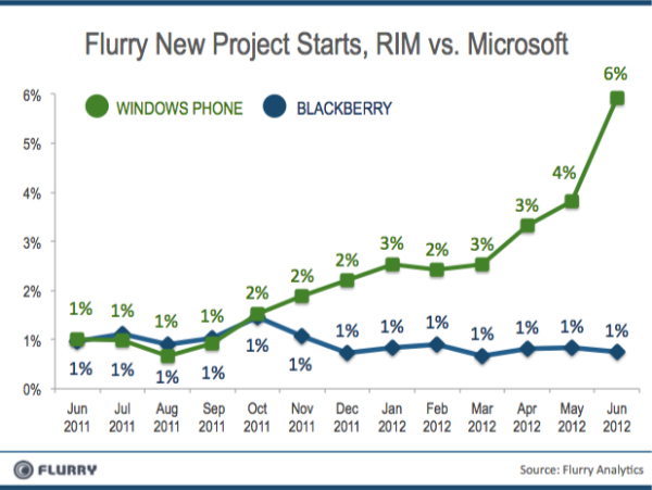 从上面的图表我们可以看出,在过去的12个月,开发者为Windows Phone平台开发的新应用程序增长了600%,2012年6月份,Windows Phone应用程序占Flurry系统总应用程序的6%,而RIM应用程序所占比例保持不变。总体看来,内置Flurry分析工具的应用数量增长了将近50%。