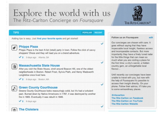 旅行者可以通过两个渠道来获得这些信息,第一个渠道是在Foursquare关注丽兹卡尔顿酒店,这样你就能看到该酒店发布的每一条新信息。