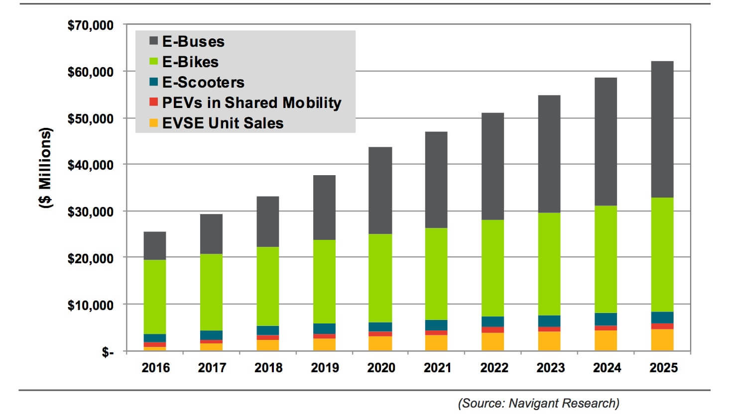 2016~2025年全球电动车设备增长预测图