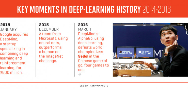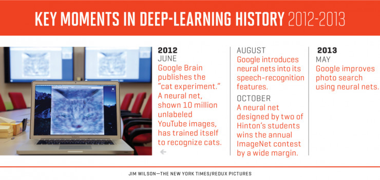 谷歌在2011年设立了专注深度学习领域的 Google Brain 项目。2012年中期,谷歌将神经网络引进其语音识别产品中。2013年3月,谷歌保留了神经网络开发者 Geoffrey Hinton。如今谷歌正在研发过程中的深度学习项目已经超过1000种,涵盖了搜索、安卓、Gmail、照片、地图、翻译、YouTube和自动驾驶汽车等众多领域。2014年 ,谷歌收购了 DeepMind,其深度强化学习项目 AlphaGo 在三月份打败了世界冠军李世石,成为了人工智能发展的里程碑。