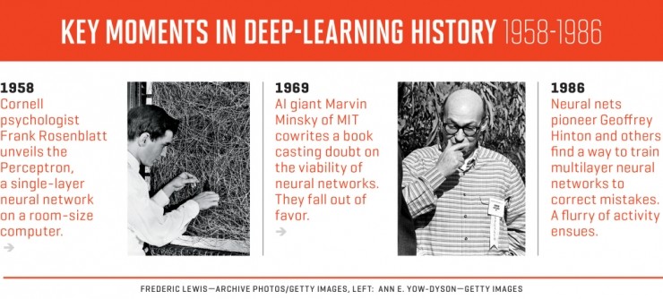 在 20 世纪 50 年代和 60 年代期间,神经万罗在计算机科学家中很盛行,在 1958 年,康奈尔大学研究心理学家Frank Rosenblatt在布法罗的实验室,在一个海军项目中,以神经网络构建了一个原型,他称之为Perceptron。他利用了一台充满整间屋子的穿孔卡片电脑,试验 50 次以后它可以辨别左右两边的卡片,《纽约时报》报道:海军认为现如今的电子计算机的雏形将来会听说读写、行走、繁殖、有存在意识。