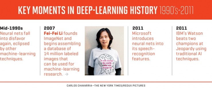 但是数据仍然在丢失,尽管互联网里充满了数据,但是大多数数据都没有被示踪,尤其是图像里的数据,于是就需要训练神经元。这也正是斯坦福人工智能教授李飞飞所研究的,“我们的视觉来源于大数据改变机器学习的工作模式,数据驱机器学习。”她在一次采访中解释。