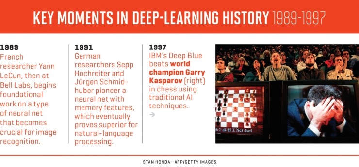 跟随 Hinton 完成博士后工作以后,LeCun 在 1988 年去了美国电话电报公司的贝尔实验室,在这个地方,他完成了接下来十年的基础工作研究,这些研究至今仍在图像识别领域被沿用。 20 世纪 90 年代,根据 LeCun 的研究,贝尔实验室的子公司 NCR 生产了一种神经元支持的产品,这种产品广泛用于银行,它可以读取支票上的手写数字。同时,两名德国研究员也独立研究了不同类型的算法,20 年后的今天,这种算法在自然语言处理应用程序中十分重要。