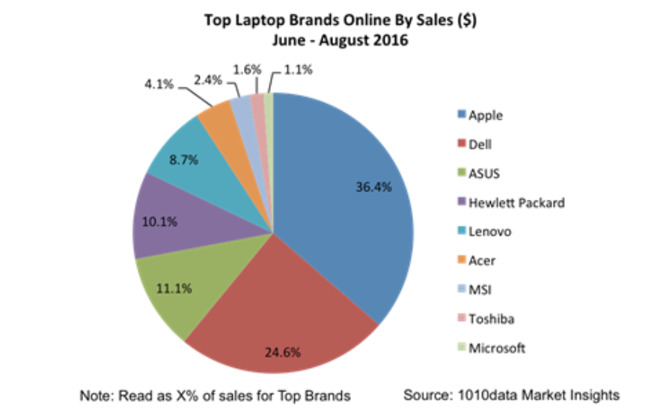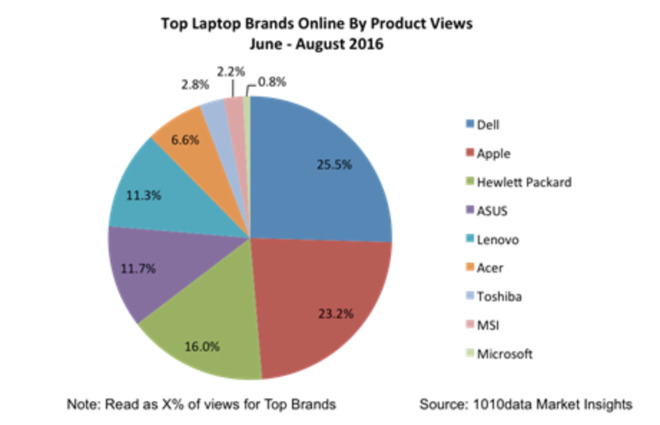 戴尔公司凭借着低价和丰富的产品线在热销设备品牌排行中占据有利位置,惠普、华硕和联想同样位居前五名。从整体上来看,1010Data表示今年夏季笔记本的销量同比增长了12%。