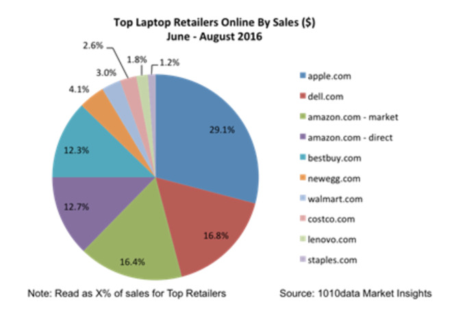 根据市场调查机构1010Data最新统计的调查数据,美国地区按照线上销售额对笔记本进行排序苹果是毫无争议的王者,随后分别是戴尔、华硕、惠普和联想。此外在选购网站方面,苹果官方网站也成为了消费者选购的首选,在所有在线零售商中的占比达到了29.1%,其次是Dell.com、亚马逊、百思买和新蛋。