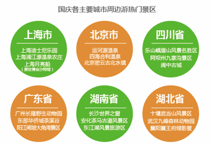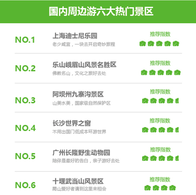 一块去旅行网通过监测黄金周景区旅游数据发现,10月1日至7日国内最热门的景区主要有上海迪士尼乐园、乐山峨眉山风景名胜区、阿坝州九寨沟景区、长沙世界之窗、广州长隆野生动物园、十堰武当山风景区。