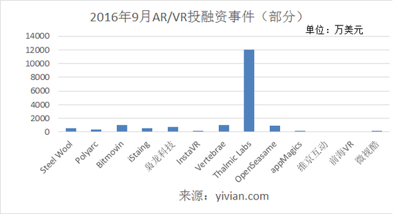 全球资本市场对AR/VR的投资在9月份总额达1.76亿美元。其中最大的一笔是手势控制臂环Myo开发商Thalmic Labs的1.2亿美元B轮融资,投资方包括英特尔和亚马逊等。