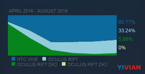 在上图8月份的数据中,HTC Vive的Steam市场份额为60.77%,Oculus Rift为33.24%,Oculus Rift DK2为5.98%。