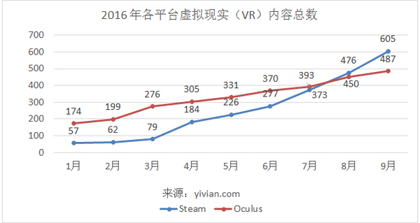 从上图YiViAn的统计数据可以看出,Steam平台的内容增长优势非常明显,9月份累计VR内容数达到605款,相比8月份增长了27.1%,而Oculus平台(含Gear VR内容)9月份累计VR内容数达到了487款,相比于8月份增长了8.2%。