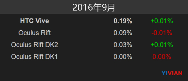 根据Steam公布的数据(如下图),在9月份,HTC Vive月活跃用户数占Steam总活跃用户数0.19%,Oculus Rift月活跃用户数占总活跃用户数0.09%,Oculus Rift DK2月活跃用户数占总活跃用户数0.03%。
