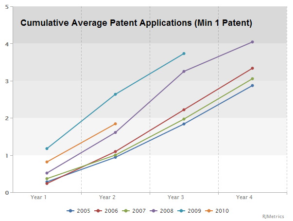 作者使用了RJMetrics的组群分析工具对初创企业专利申请的动向进行分析。方法是按照初创公司的成立年份分组,然后比较每组公司的平均专利申请数量。