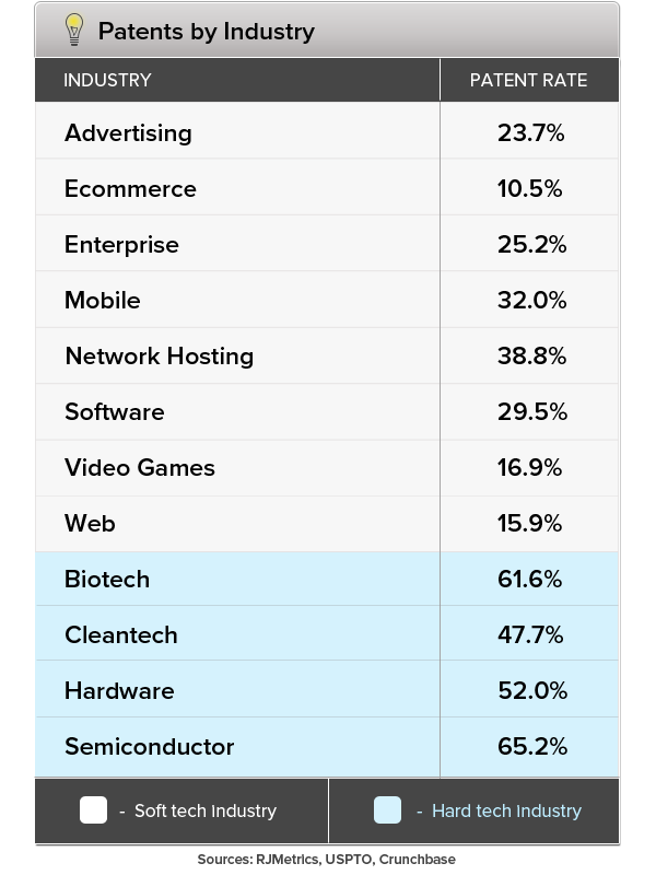 半导体和生物技术行业的专利申请率最高(分别为65%和62%)。在早期阶段需要大量资金支持的“硬件技术”类行业更有可能祭出专利作为知识产权保护的武器。而“软件技术”行业,如电子商务、web、视频游戏的专利申请率则相对较低(低于20%)。
