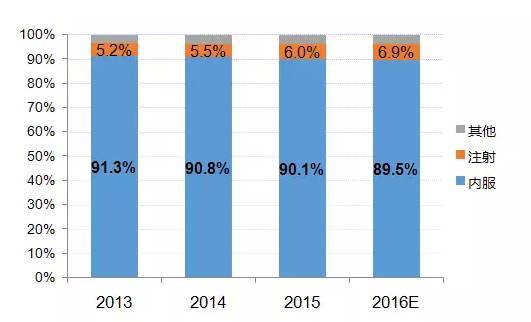 根据中康CMH研究数据,2015年,中国慢病药总体市场规模7323亿元,同比增长7.3%。预计2016年市场规模7948亿元,平均增长速度下降到10%左右。从给药途径细分来看,注射剂占了慢病药市场48.9%的份额,口服剂型占49.1%,口服剂型增长略快一些,市场份额略有扩大。